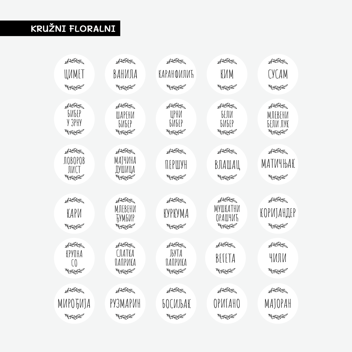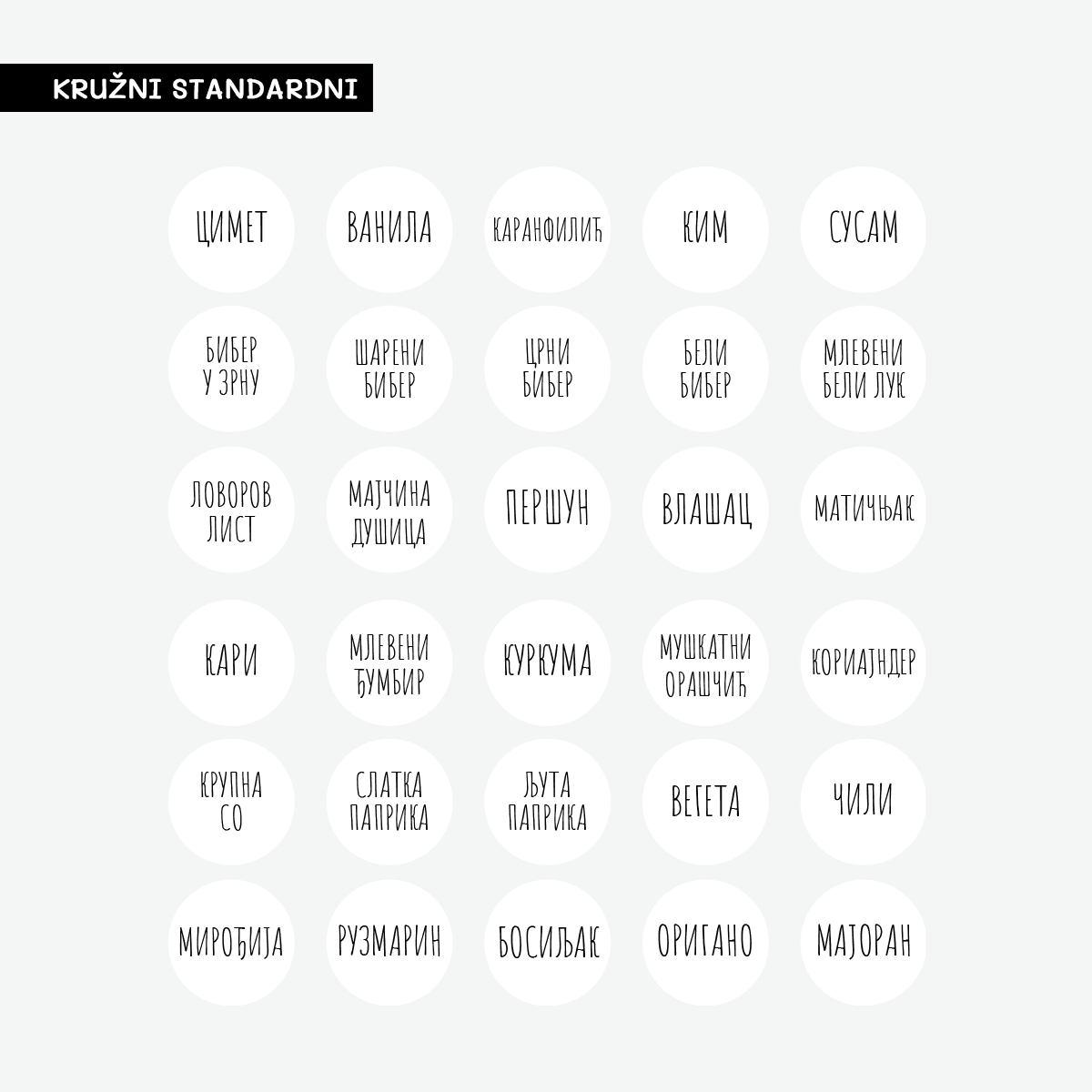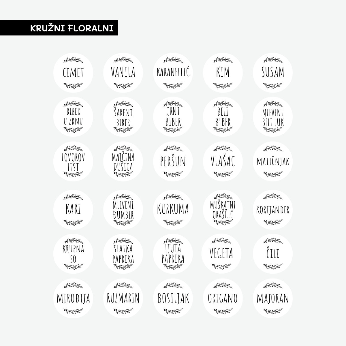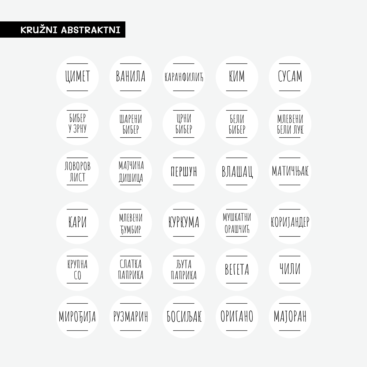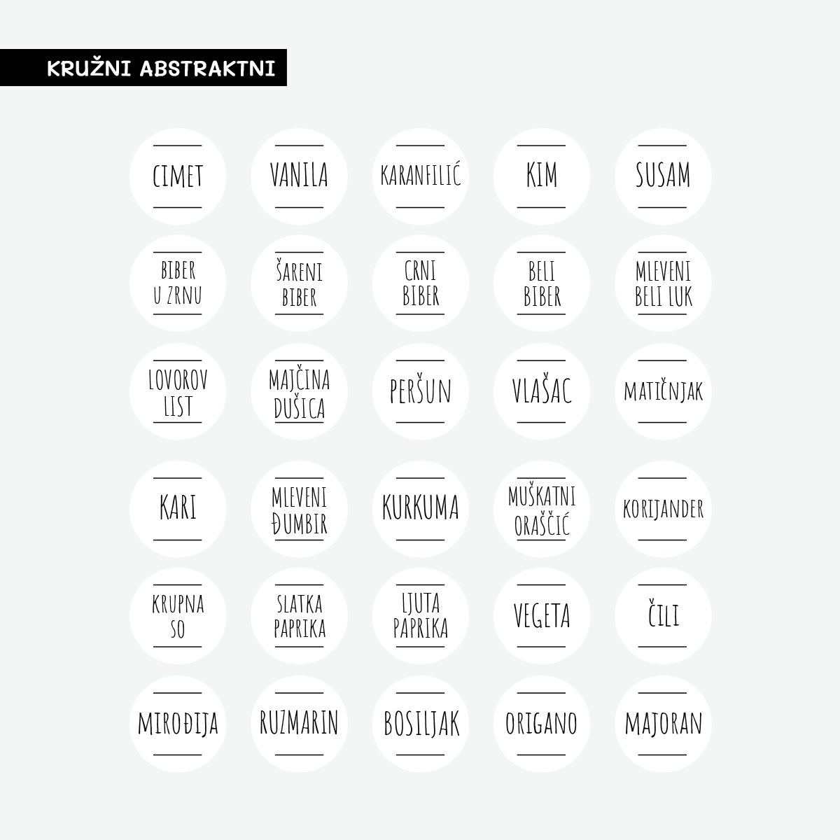Ovaj praktični SET sastoji se ukupno od 30 nalepnica namenjenih za obeležavanje teglica i bočica za začine.