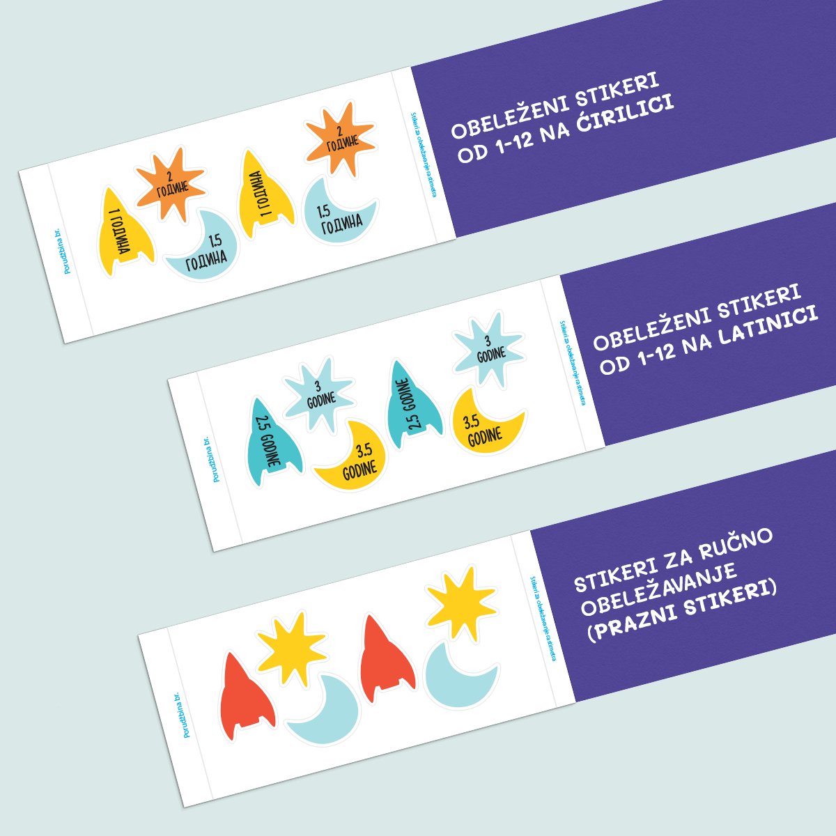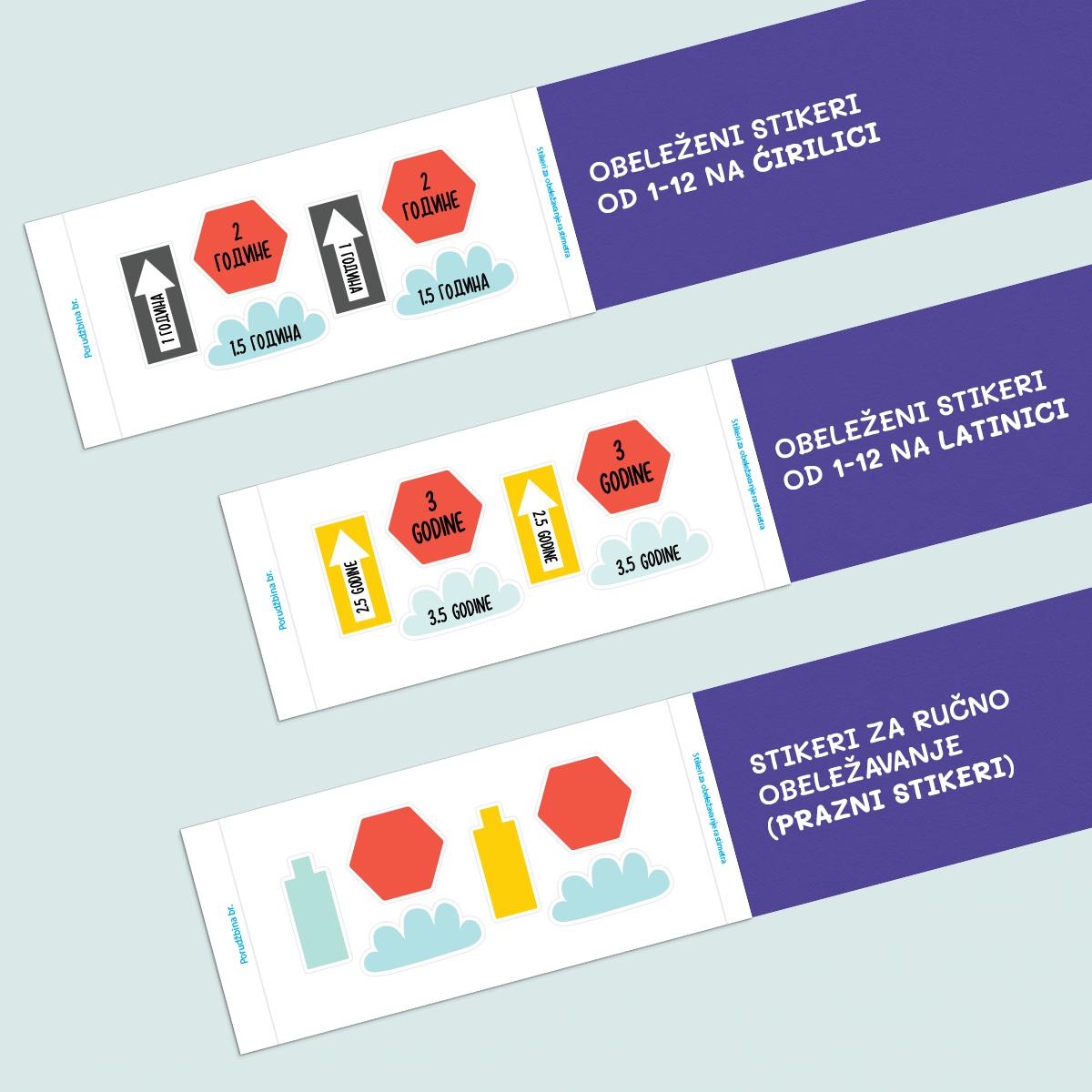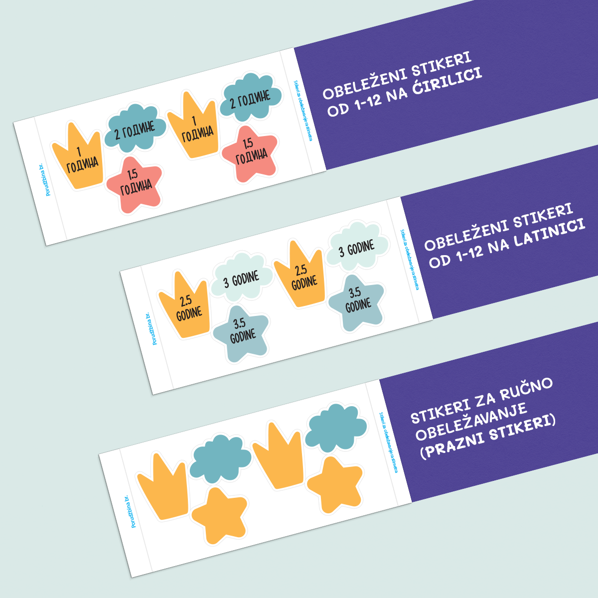 Takođe dobijate 24 praznih stikera u kojima ćete moci ručno da upišete bitne trenutke odrastanja vašeg deteta (ime, rast, godine, datum, polazak u vrtić, prvi dan u školi…)