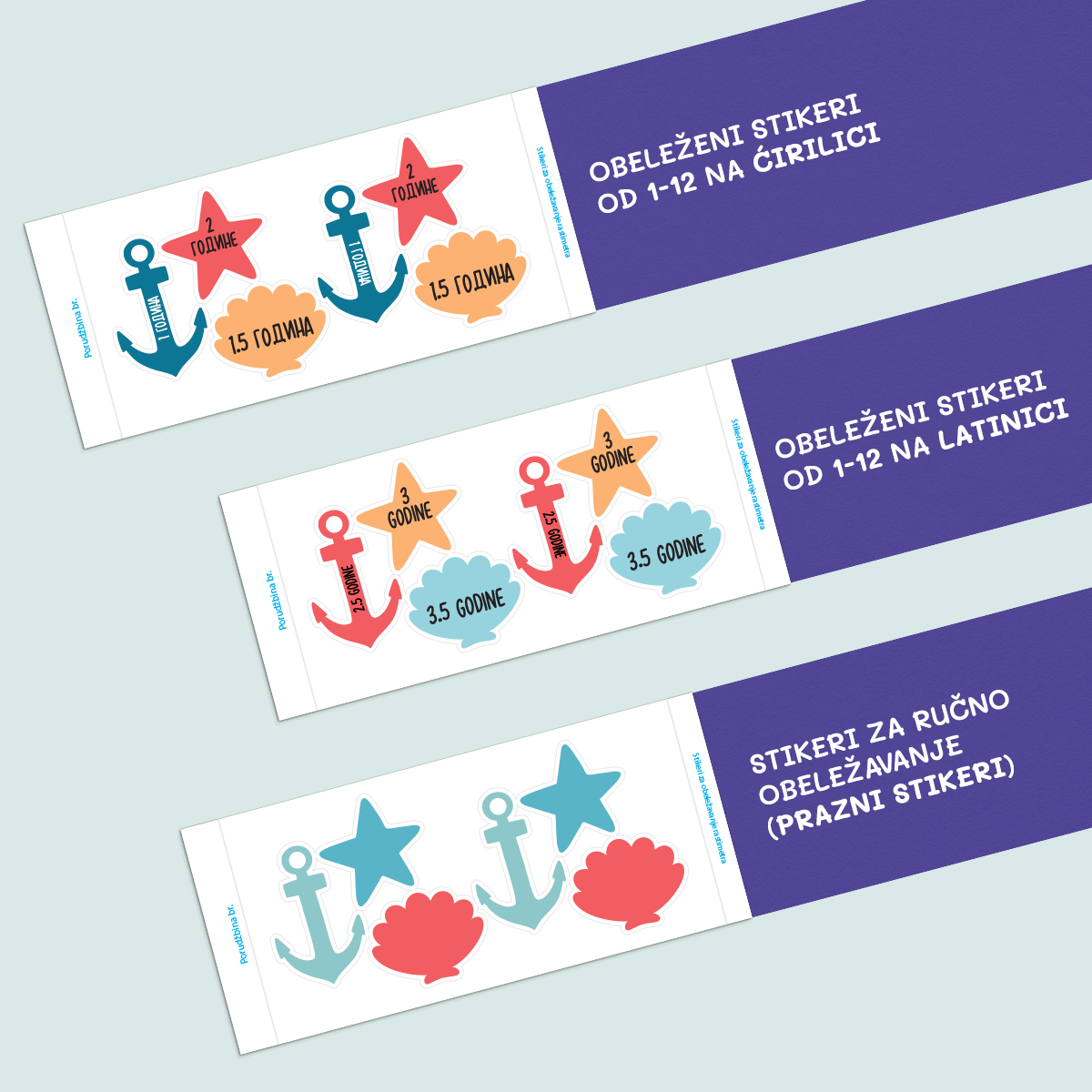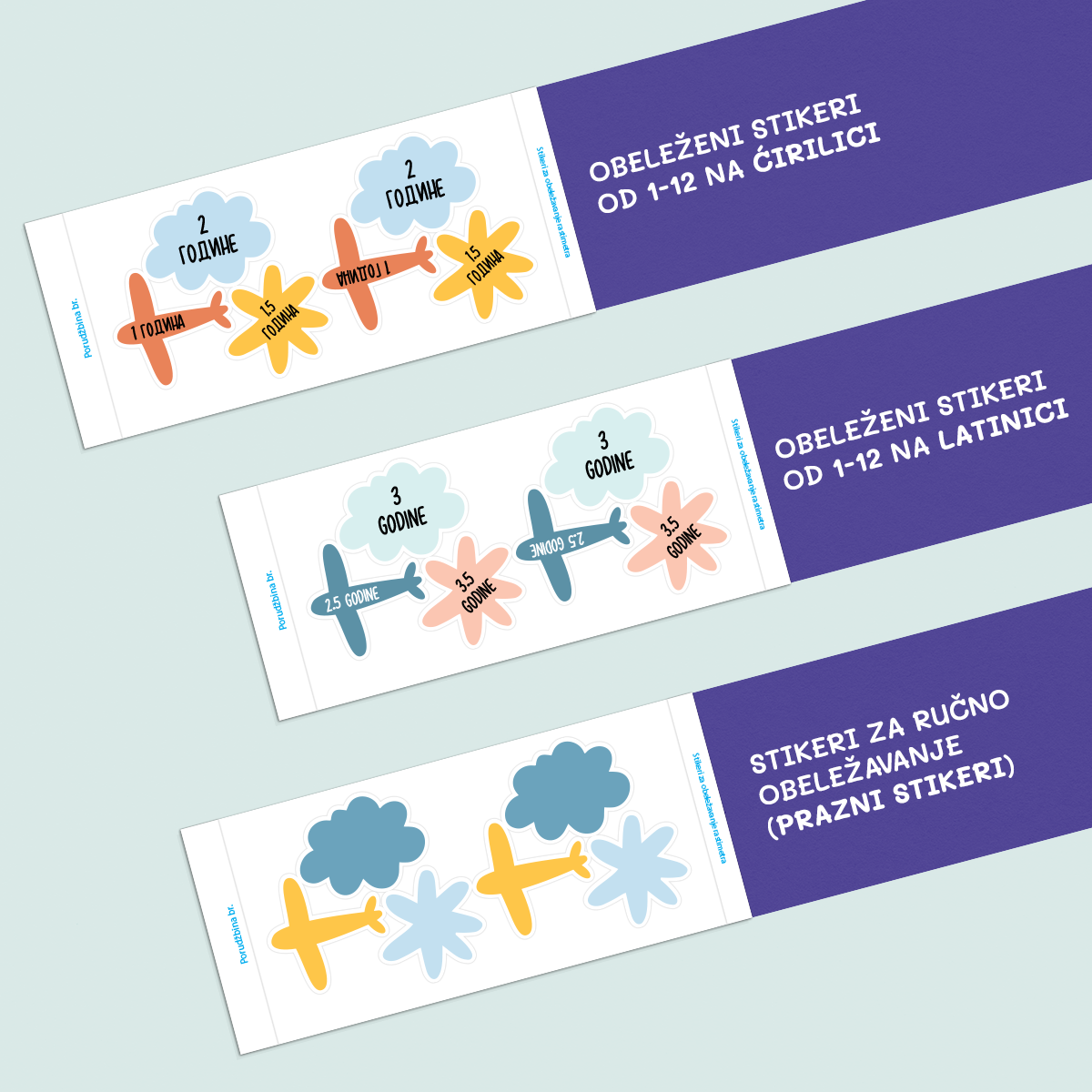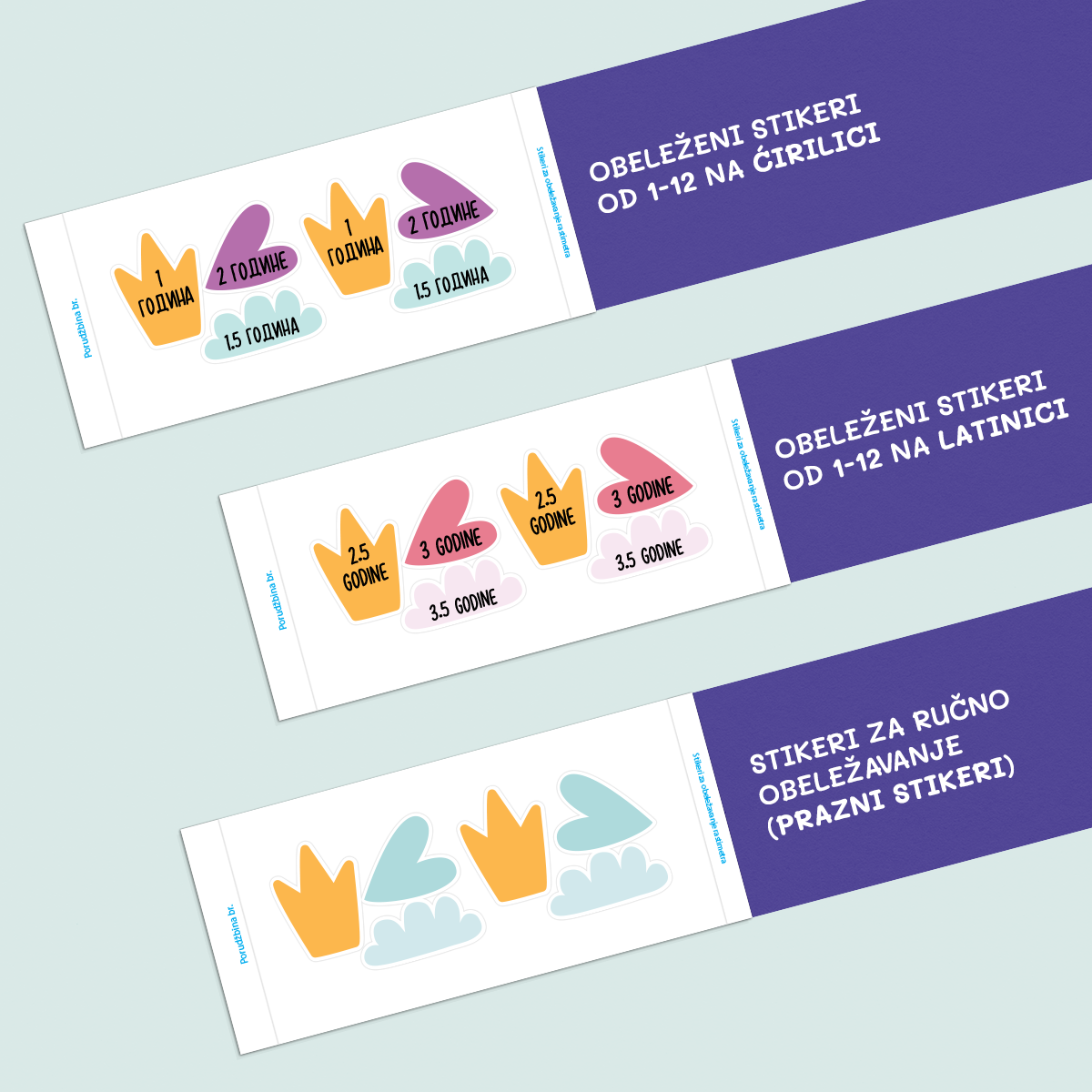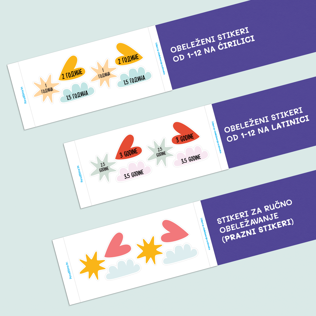 Takođe dobijate 24 praznih stikera u kojima ćete moci ručno da upišete bitne trenutke odrastanja vašeg deteta (ime, rast, godine, datum, polazak u vrtić, prvi dan u školi…)