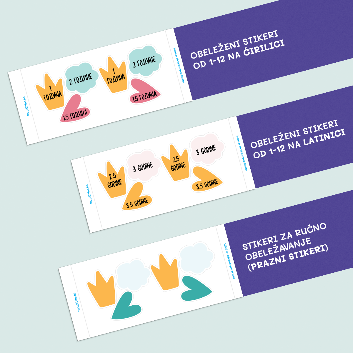 Takođe dobijate 24 praznih stikera u kojima ćete moci ručno da upišete bitne trenutke odrastanja vašeg deteta (ime, rast, godine, datum, polazak u vrtić, prvi dan u školi…)