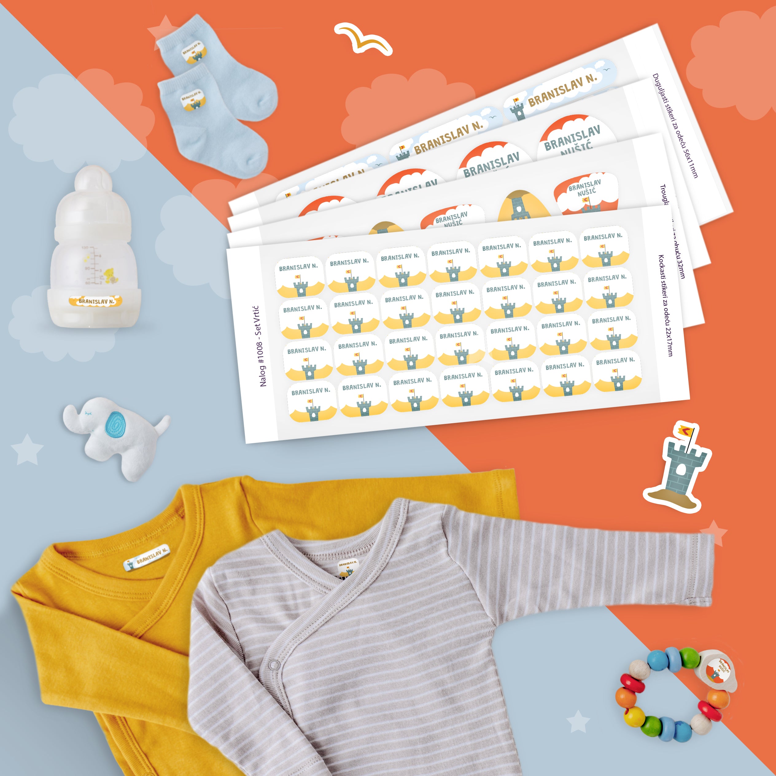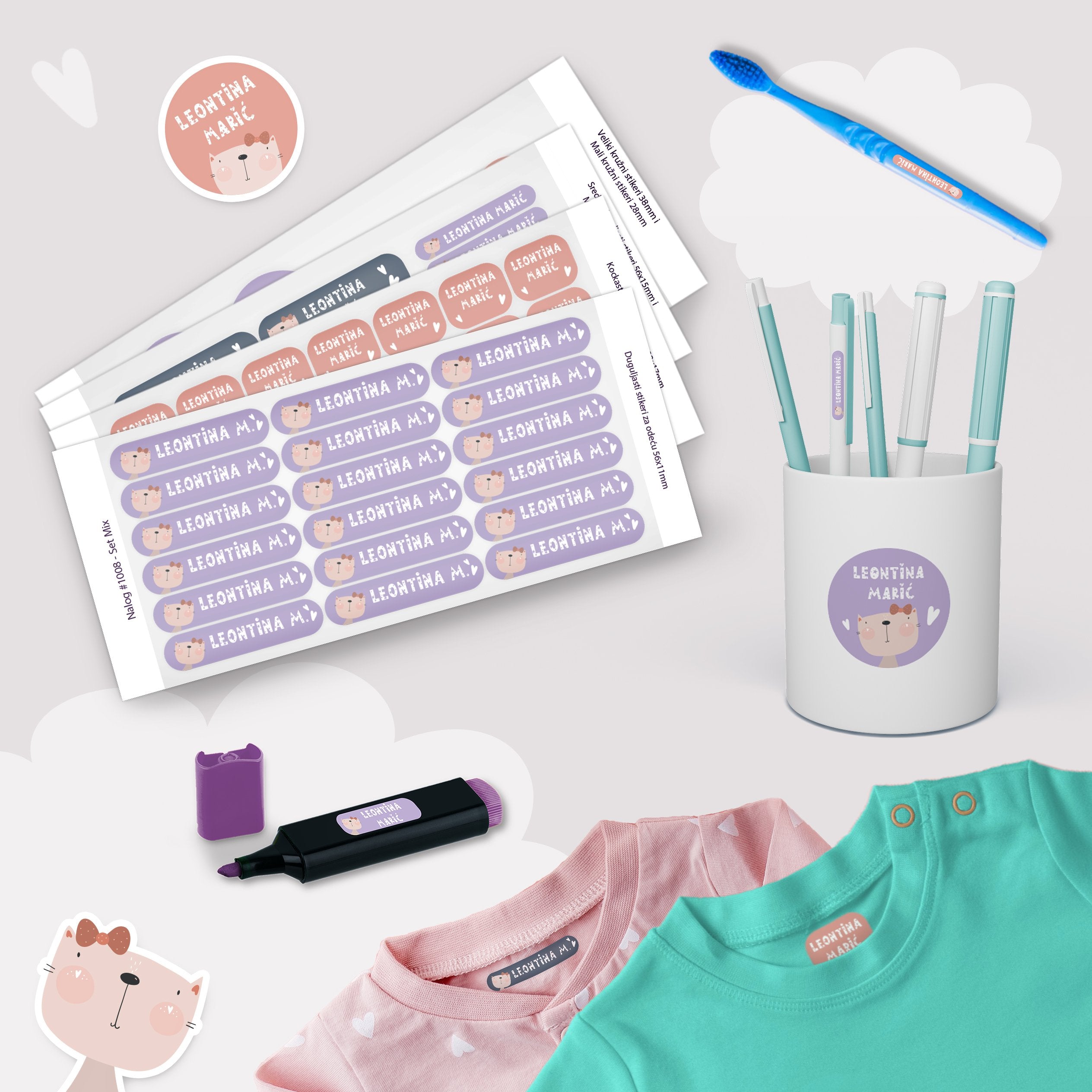 Set sadrži 82 stikera sa dizajniranim podlogama, koje možete personalizovati unošenjem imena vašeg deteta, uz mogučnosti odabira vrste i boje fonta, a zatim ih zalepiti na odeću, obuću, predmete, olovke, pribor za jelo, itd.